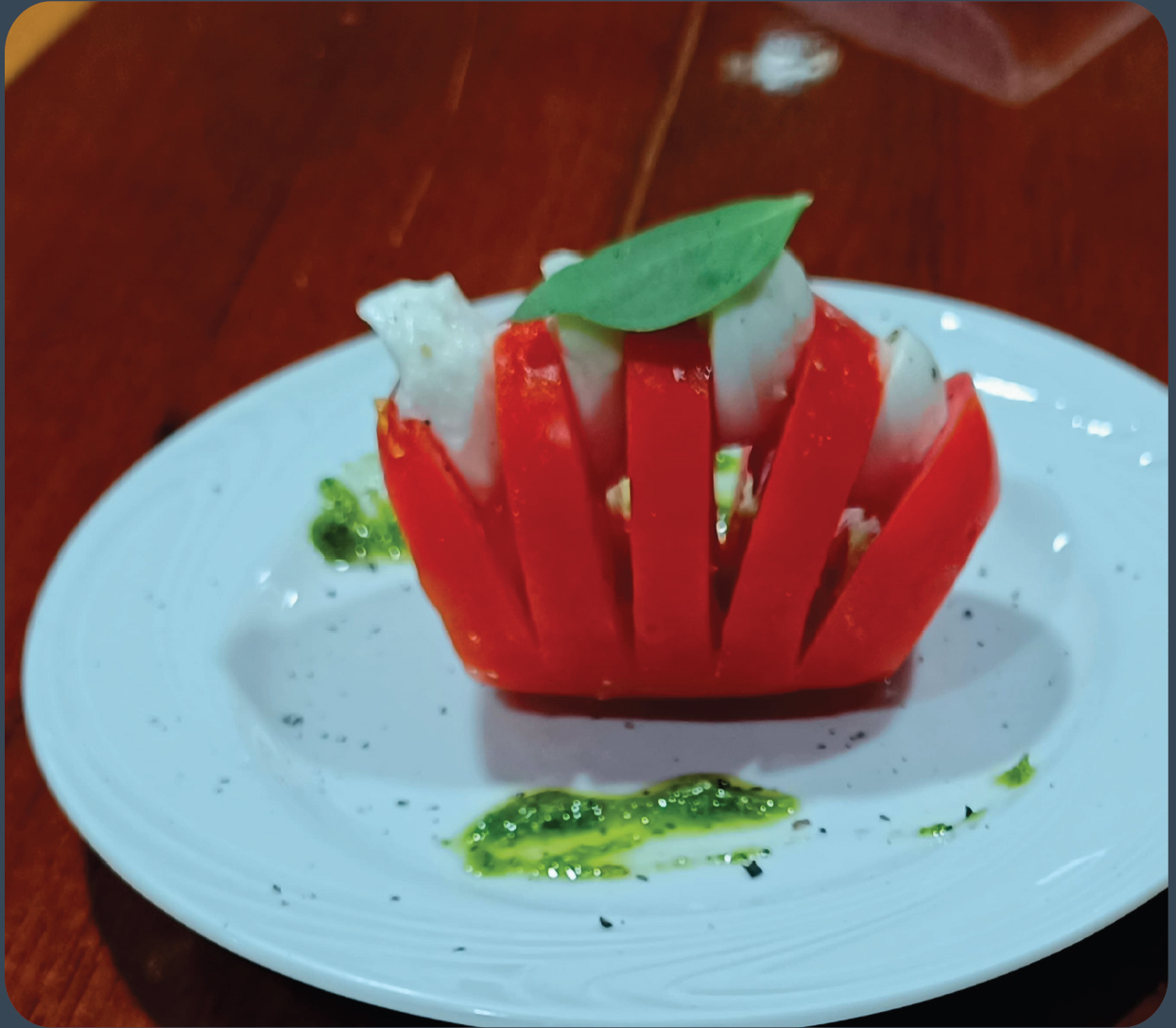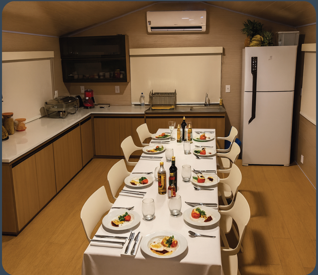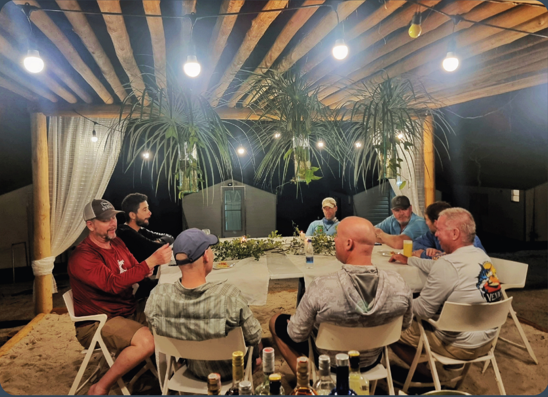 Ao final de cada dia de pesca nas águas selvagens da Amazônia, nossos oito hóspedes são recebidos com uma experiência gastronômica exclusiva e memorável. Tudo começa com entradas e petiscos servidos ao ar livre, na praia, enquanto o sol se despede no horizonte. Em seguida, o jantar é servido em nosso restaurante climatizado, com um menu completo que inclui: